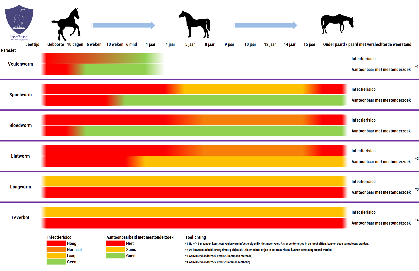 | Aantoonbaar met mestonderzoek | Ja, vanaf 10 dagen nadat het veulen is geïnfecteerd kunnen er wormeitjes worden waargenomen in de mest |